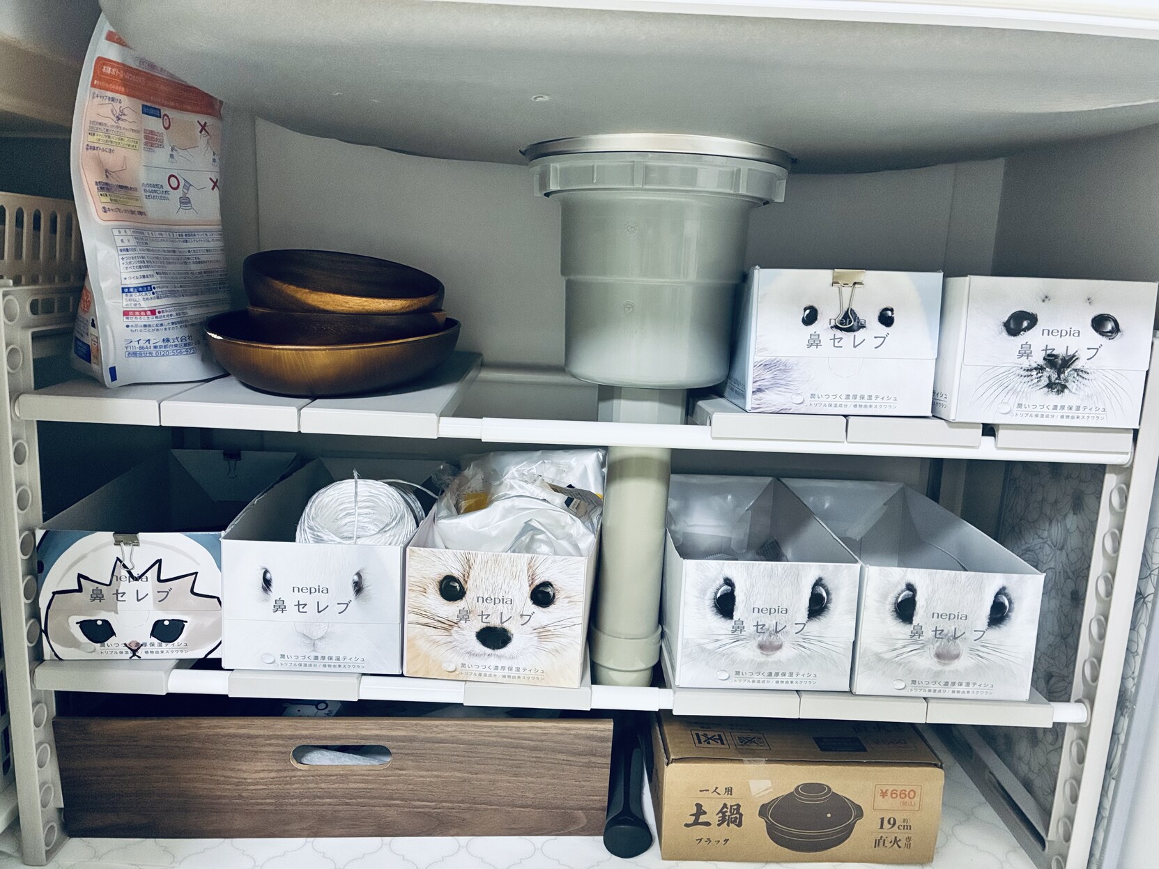 厨房下方橱柜的柜门挂了几个专用的挂钩,外侧是放擦碗布和擦手毛巾的,内侧是挂勺子、铲子之类的。很久以前的家是挂在灶台周围,然而这样油星会溅上去,想了想还是现在这样比较好。柜子里又塞了个双层的抽屉收纳,放纳米海绵、吸油棉花、花瓶之类的,还有个可以绕开厨房水管的两层收纳,用纸巾盒自己diy了许多个小分隔,放抽油烟机滤网、清洁剂、洗碗布、塑料袋、换下来的原水龙头之类的,基本上厨房要用到的东西都放在这了。
