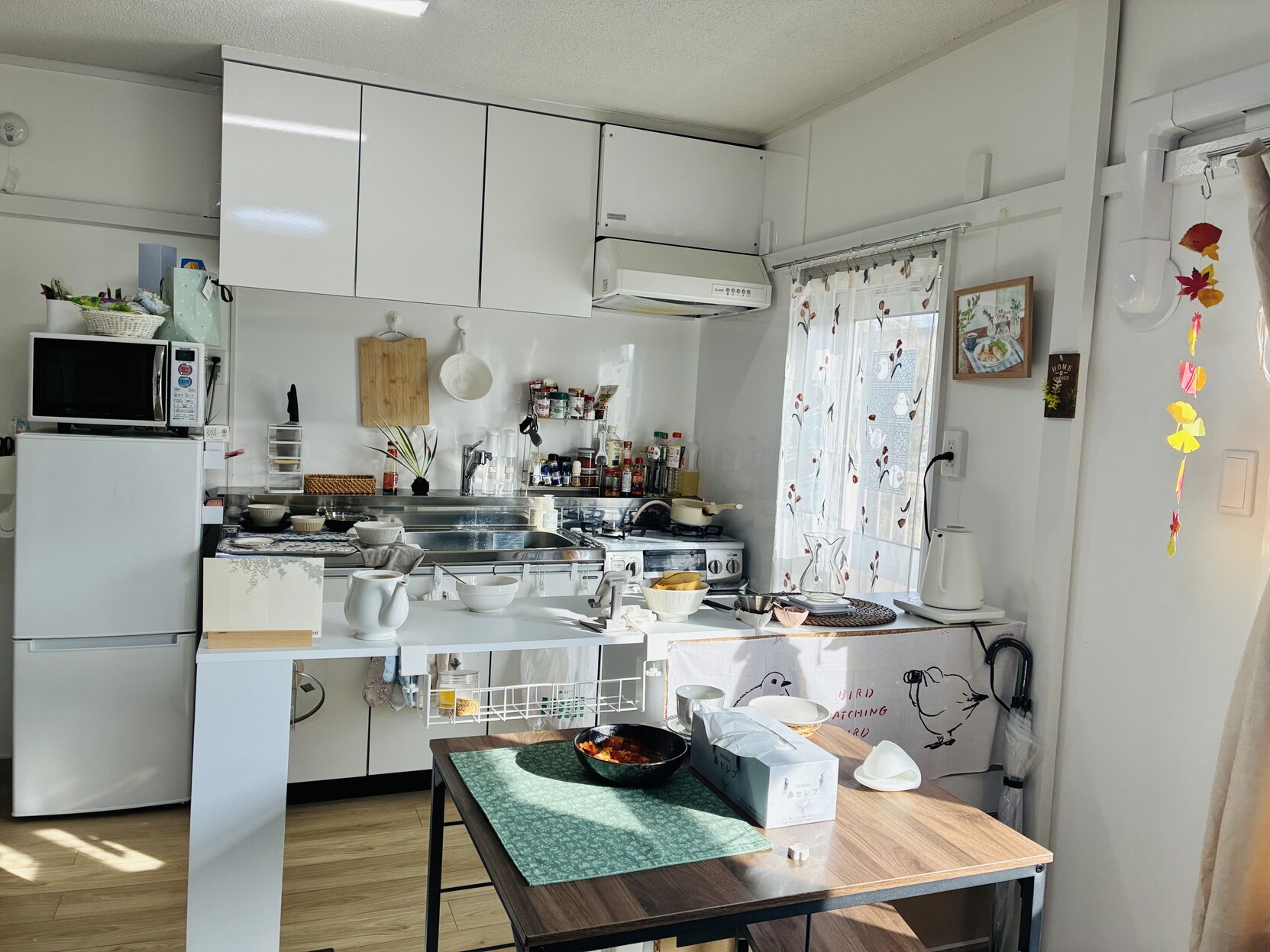 吧台这边也承担了一部分的收纳功能,台面上倒没啥,就放了个热水壶; 中间挖空的部分放了好几个常用茶叶罐和咖啡罐,拉出来弯腰就能用,旁边就是电饭煲;长柜子里也装的是茶叶、皮蛋、咸鸭蛋还有一些空了的罐子,方便以后装东西;矮柜子里装的是比较重的也不太常用的,像是燕麦、绿豆、小苏打、柠檬酸之类的。