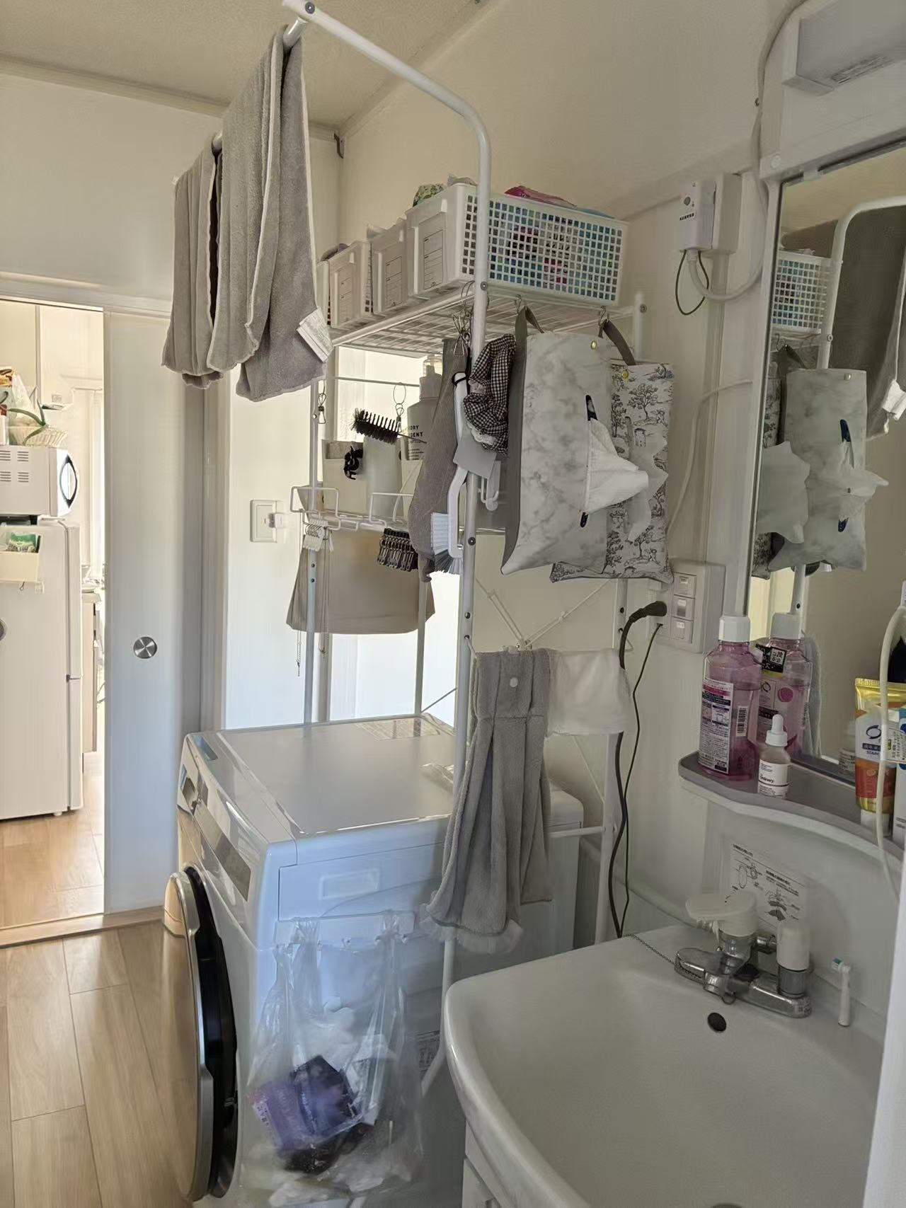 洗衣机还可以用磁吸收纳,所以我把一个用不着的磁吸挂钩放到这里来,装垃圾袋了。平常洗面台周围换下的滤网、用过的纸巾、一些擦过洗面台脏了的洗脸巾都会扔到这里,到扔垃圾的日子再一起扔进垃圾袋里。 原来我还有个专门收纳脏衣的筐的,现在找不到地方放,已经收进壁橱里了。脏衣服就直接扔进洗衣机里,虽然说是这样不透气对洗衣机和衣服都不好,但是我又不会堆很久!能攒够一身衣服基本上就会开一次洗衣机了,所以也就没把这个当回事了。