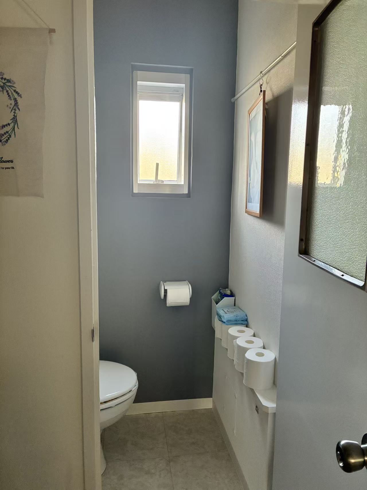 厕所正好前面也有个小平台,放了些备用的卷纸和一次性马桶刷头,刷子的话则是用吸盘挂钩挂在马桶旁边。