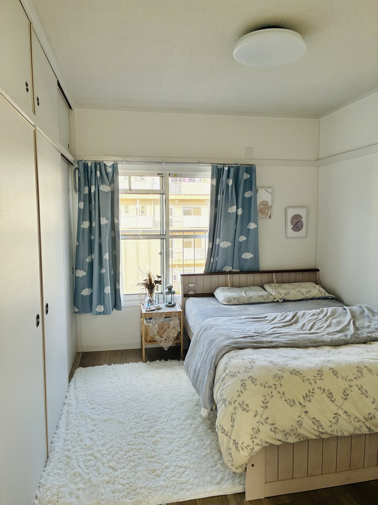 - 买了白色绒毛大地毯,还给墙上换了装饰画!现在我的卧室大概长这个样子,家里又多了一个可以休息的角落了,嘿嘿。