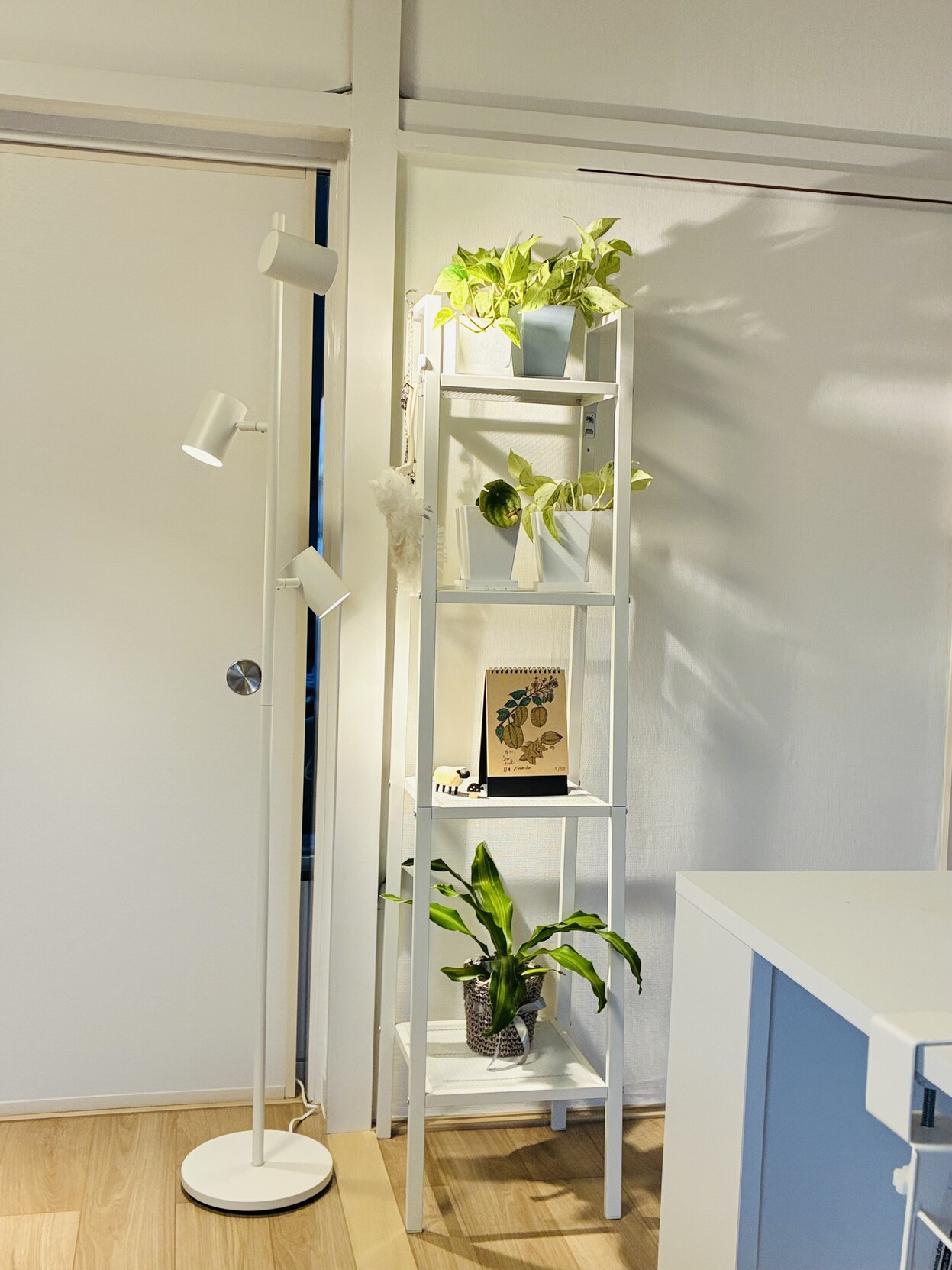 买了落地灯,调过一次位置,原来放在餐桌旁边效果不是很理想,现在放在植物架子旁边,晚上打开之后照出植物的影子很棒。可惜想要配套使用的智能插座还没发货,依旧要手动按开……